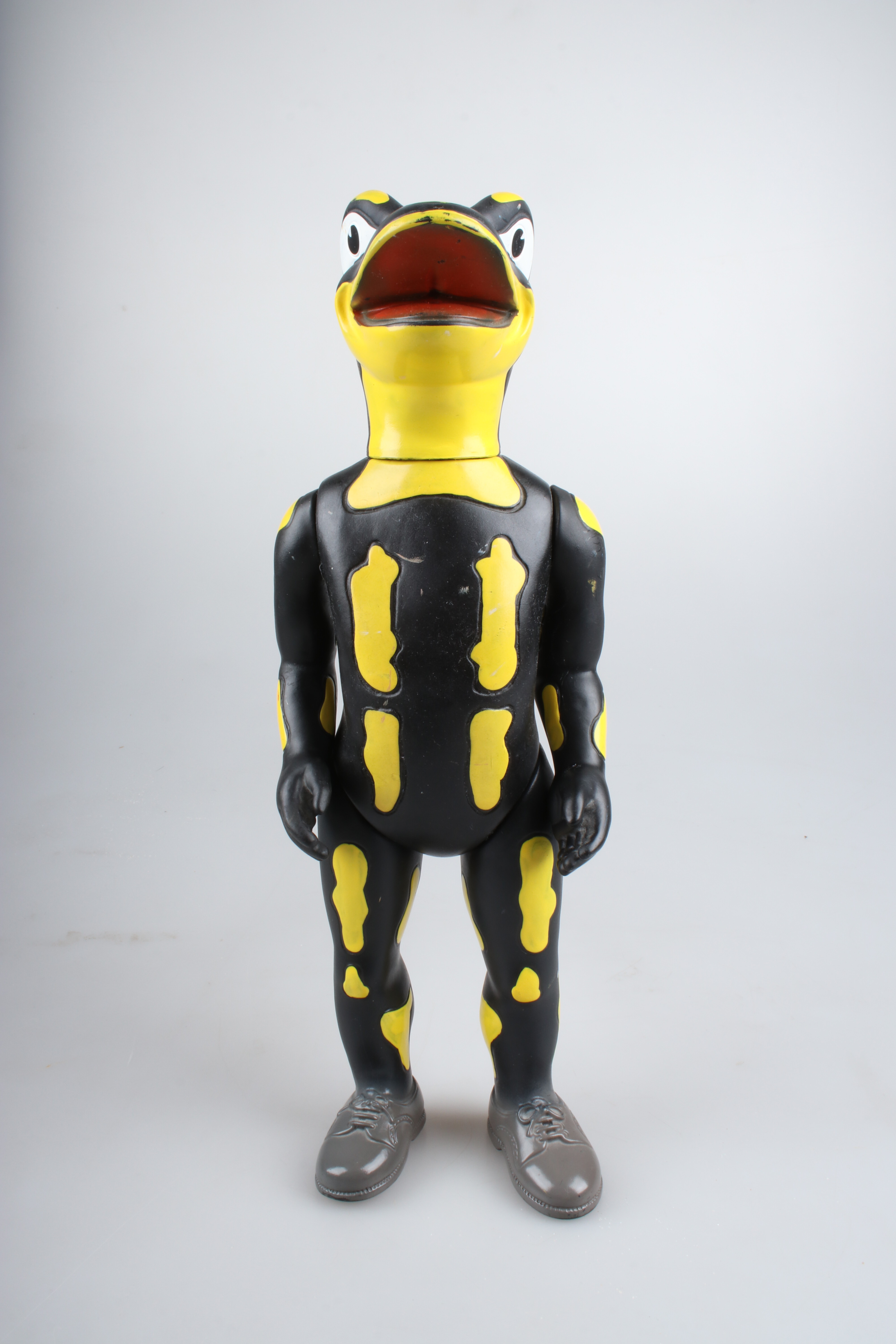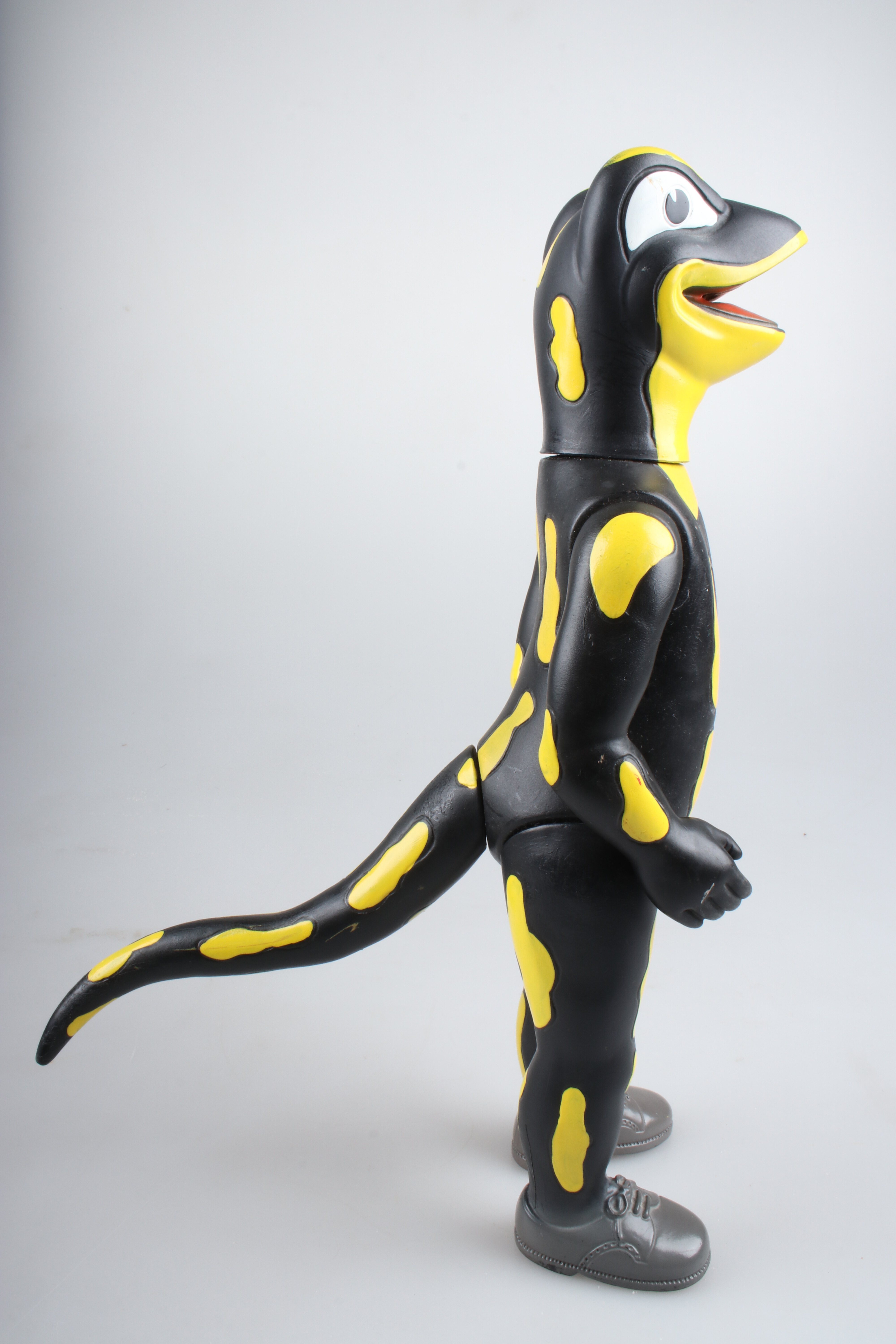 Viele kennen ihn noch aus Kindertagen: Lurchi, das Maskottchen des Schuhherstellers Salamander. Seit 1936 bekam man beim Kauf von Kinderschuhen der Marke Salamander Comics dazu geschenkt. Sie handelten von Lurchis Abenteuern, die in Reimen verfasst waren. Ab den 1950er Jahren avancierte er zur Kultfigur und es gab immer mehr Lurchi-Artikel wie diese begehrte und relativ teure Kunststofffigur. Für die vielen Lurchi-Fans, die es noch heute gibt, ist dieses Objekt etwas sehr kostbares.